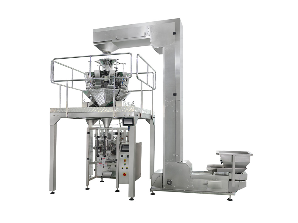 La línea de envasado de caramelos consta de un elevador de cangilones, una plataforma de trabajo, una pesadora multicabezal, una máquina de envasado vertical de formado, llenado y sellado (VFFS) y una cinta transportadora de producto terminado. La línea de producción permite el pesaje, la formación de bolsas, el llenado, el sellado y el transporte totalmente automatizados, ofreciendo alta precisión, alta eficiencia y control inteligente. Es ideal para la producción continua a mediana y gran escala.